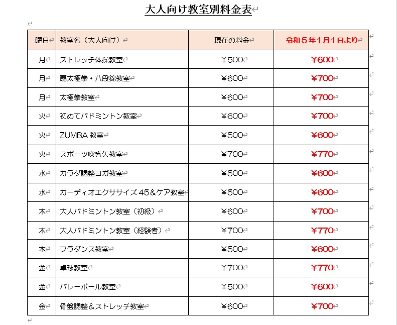 このような状況の中、大変申し訳ございませんが、令和5年2月1日より(但し、子供向け教室は令和5年4月1日より。別途ご案内します)、各教室料金を改定させて頂きました。ご利用者の皆様にはご負担をいただくことになりますが、何卒ご利用のほど宜しくお願い申し上げます。