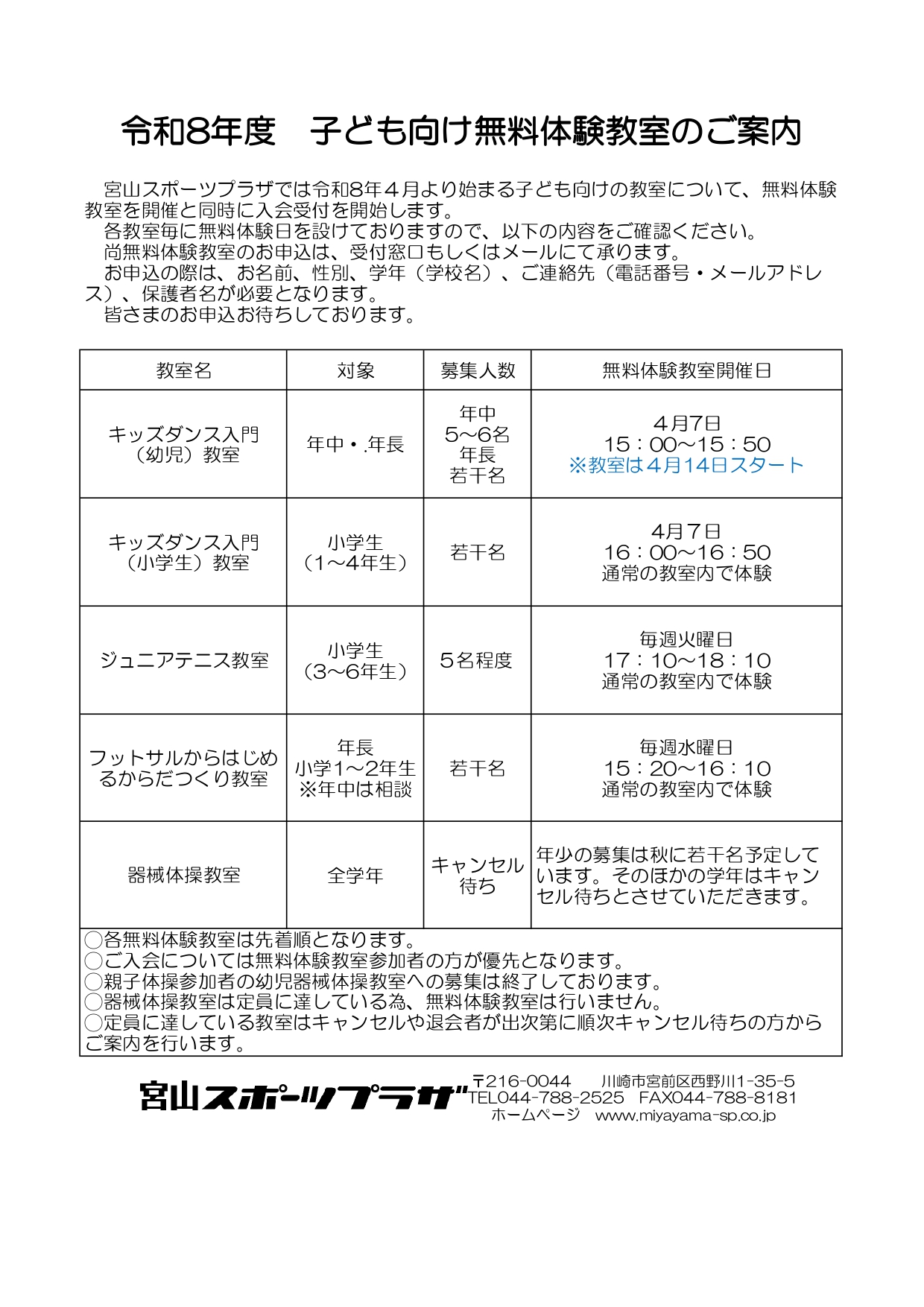 尚、器械体操教室につきましては、継続・キャンセル待ちの方が多く定員超過の為募集は致しませんのでご了承ください。キャンセル待ちは承ります。